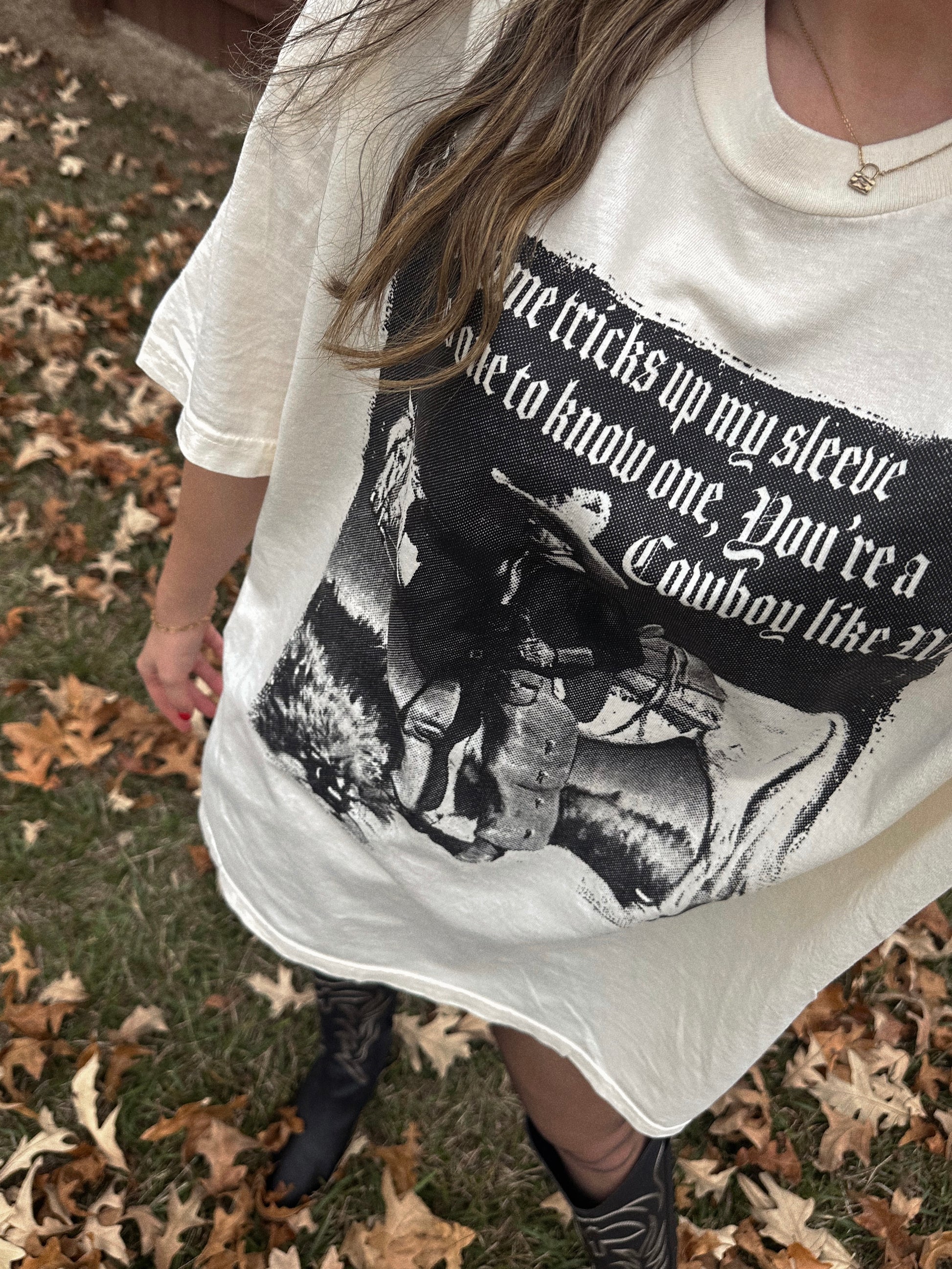 - Features lyrics from the song "Cowboy Like Me" with a cowboy graphic in halftone all in a black ink